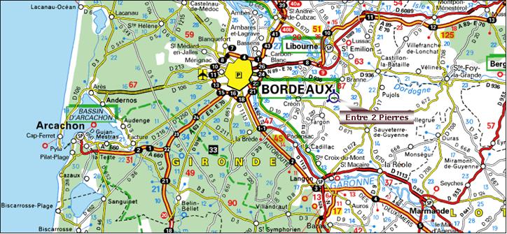 COMMENT VENIR ? ![]() Cliquez ici et calculez votre itinéraire. Si vous possédez un GPS : Latitude 44.7815 / Longitude -0.2087 - Depuis Le Nord de la France, accès par l'A10. - Depuis le Centre et Rhones Alpes par l'A89. - Depuis le Sud Est l'A62. - Depuis le Sud Ouest et l’Espagne l'A63. ![]() les gares TGV de Libourne à 20Km et de Bordeaux à 40Km. ![]() Aéroport de Bordeaux Mérignac |